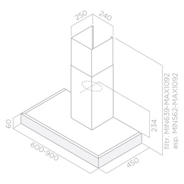 Largeur 90 cm - 3 Niveaux de Puissance - Volume d'aspiration: 850 m3/h - Boutons - Eclairage: 2 Spots Halogène x 20W - Filtre aluminium lavable - Filtre anti-odeur en charbon Optionel - Classe énergétique A - Diamètre évacuation 150 mm - Couleur: Inox - Garantie 2 ans