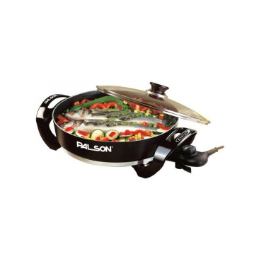 Multicuiseur éléctrique Palson 30469 - Puissance: 1500W - Capacité: 5.5 L - Diamètre: 35 cm - Epaisseur: 5 mm - Couvercle en verre trempé avec aérateur vapeur - Poignées en acier inoxydable froides - Thermostat réglable avec témoin lumineux de fonctionnement - Pieds antidérapants - Garantie 1 an