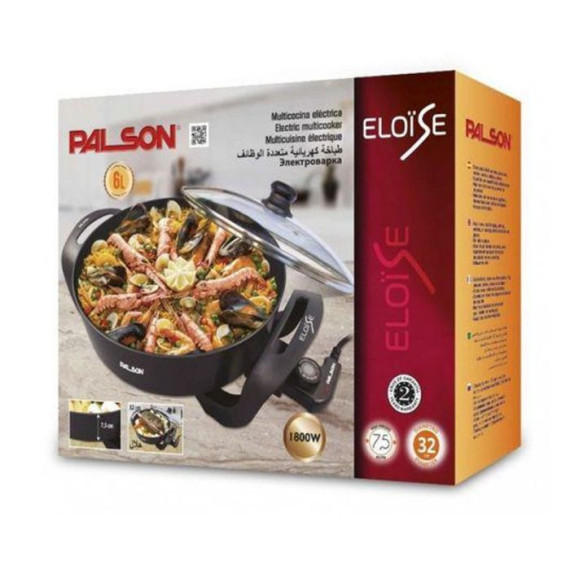 Multi Cuiseur Electrique PALSON Eloise - Puissance: 1800 Watts - Capacité: 6 litres - Surface avec revêtement antiadhésif - Couvercle en verre avec poignée et soupape de sécurité - Thermostat réglable et démontable pour faciliter son nettoyage - Idéale pour frire, cuisiner, rôtir, préparer paellas, omelettes et pizzas - Finition élégante moderne - Dimensions: 46,7 x 38,9 x 15,8 cm - Couleur: Noir - Garantie: 3ans