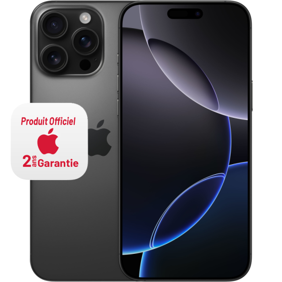 Double SIM (Nano-SIM, eSIM) - Écran 6.9" Super Retina XDR OLED, (2868 x 1320 pixels) - Processeur Apple A18 Pro 6 coeurs - Capacité de stockage: 256 Go - Système d'exploitation iOS 18 - Assistant intelligent Siri - Réseau 5G - Wi-Fi 7 - Bluetooth 5.3 - Résolution de l'appareil photo: 48 Mpixels - Résolution des Caméras arrière: 12 Mpixels - Résolution du Caméra avant: 12 Mpixels - Indice de protection: IP68 - Charge rapide USB-C - Type de batterie: Lithium-ion - Technologie de charge rapide: MagSafe - Poids: 199 g - Couleur Noir - Garantie 2 ans