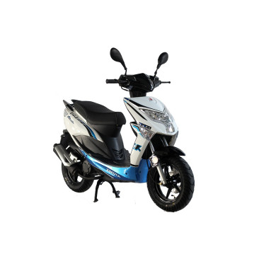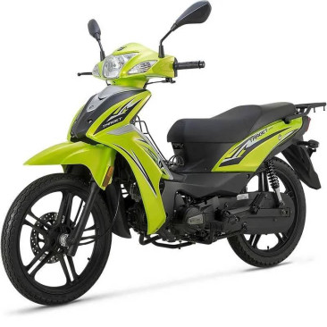 Quelques points forts :Démarrage électrique et au kick. Frein avant à disque 160 mm et frein arrière à tambour 110 mm pour une bonne sécurité. Suspensions efficaces : fourche hydraulique à l’avant (70 mm de débattement) et amortisseur à l’arrière (45 mm). Pneus 120/70-12 à l’avant et à l’arrière, ce qui améliore la tenue de route. Réservoir de 5,5 L, poids à sec ~ 87 kg.