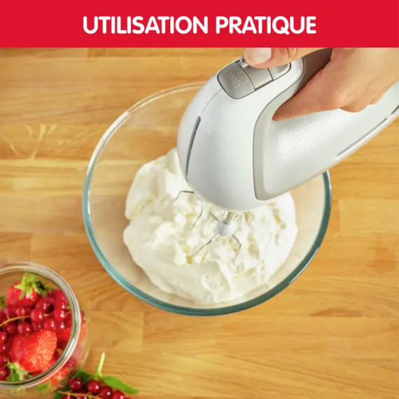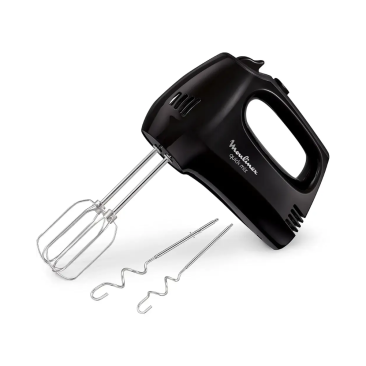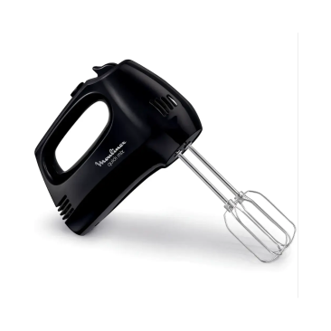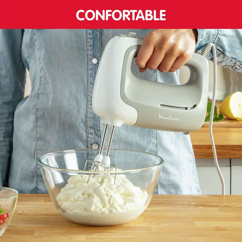 Batteur À Main MOULINEX - Puissance : 450W - Nombre de vitesses : 5 Vitesses - Fonction Turbo - Bouton d'éjection - Fouets en Acier inoxydable - Crochets pétrin en métal - Accessoires : 2x fouets, 2x pétrins - Couleur : Blanc et Gris - Garantie 1 an