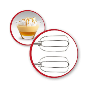 Découvrez le plaisir des pâtisseries maison. Blancs en neige ultra aérés, crème fouettée et Chantilly, pâte à pain... votre batteur est le partenaire incontournable de vos pâtisseries ! Pour réaliser des blancs en neige, de la crème fouettée et des pâtes à pain. Son moteur d’une puissance de 300 watts autorise 5 vitesses de fonctionnement plus une fonction 'Turbo', pour respecter les exigences de chaque préparation. Les fouets en inox sont parfaits pour les blancs en neige, la crème fouettée et les pâtes à gâteaux. Les pétrins vous permettent de réaliser des pâtes à pain et à pizza.