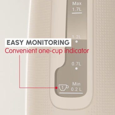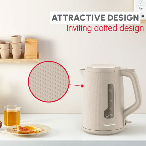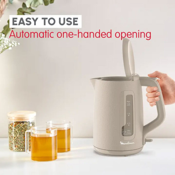 Bouilloire Électrique MOULINEX - Utilisation : Sans fil - Capacité : 1.7 Litre - Puissance : 2000-2400W - Atteinte de l'ébullition : Rapide 106 - 180 secondes - Indicateur de niveau d'eau - Interrupteur marche/arrêt - Arrêt automatique - Base rotative 360° - Filtre anticalcaire Amovible - Couvercle à ouverture assisté - Design & Matériau : Plastique - Couleur : Beige Chaud - Garantie 1an