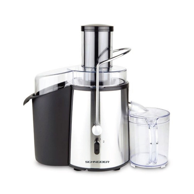 Centrifugeuse à Jus SCHNEIDER – Puissance 1000 W, Réservoir 2 L, 2 vitesses avec fonction Turbo et mélangeur, Couverture transparente, Pièces amovibles pour un nettoyage facile, Verrou de sécurité, Bouche d’écoulement réglable, Rangement pour câble intégré, Couleur Inox, Garantie 1 an