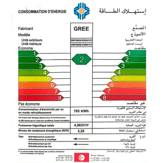 Climatiseur GREE Tropicalisé ON/OFF - Puissance : 18000 Btu - Mode de refroidissement : Chaud / FROID - Classe énergétique : 2 - Classe Climatique : T3 - Fonction "I Feel" - Type de Gaz : R410A - Niveau Sonore unité intérieur : 54dB Max - Niveau Sonore unité extérieur : 63dB - Dimensions : 982×311×221mm (Intérieur) / 802×555×350mm (Extérieur) - Smart : Non - Garantie 3 ans