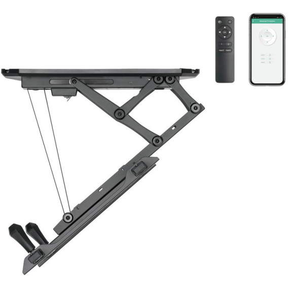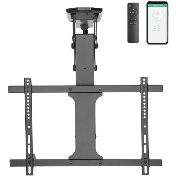 Support plafond Kimex Pour Téléviseurs - Taille écran 32"-70" - Fonction Encastrable, Motorisé - Charge maximale 35 kg - Montage Vesa (200x100 mm) jusqu'à (600x400 mm) - Installation Plafond - Pivot (paysage/portrait): Ajustable +/-2° - Hauteur/plafond: Ajustable de 10,8 cm (fermé) à 72,5 cm (ouvert) - Support par Wi-Fi - Passage des câbles - Avec Télécommande RF - Matériau: Acier, plastique - Dimensions: 557 x 660 x 108 mm - Poids: 9.5 Kg - Couleur Noir - Garantie 1 an