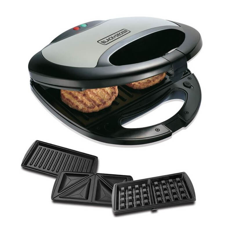 Appareil De Cuisson 3 EN 1 BLACK&DECKER - Pour Panini, Croque monsieur, Gaufre - Puissance: 750 Watts - Revêtement antiadhésif - Plaque interchangeable - Commande thermostatique - Touché extérieur froide - Témoin lumineux prêt à cuire - Couvercle verrouillable - Stockage vertical peu encombrant - Facile à nettoyer - Couleur Noir - Garantie 1 an