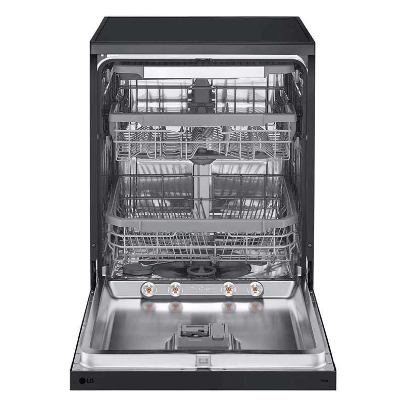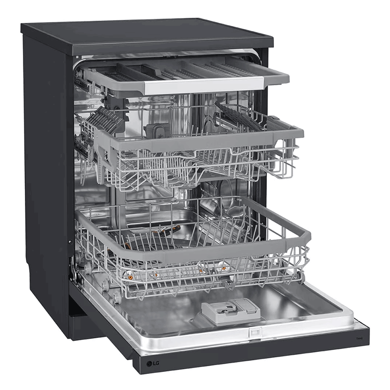 Lave Vaisselle LG - Nombre de couverts : 14 Couverts - Nombre de programmes : 8 Programmes - TrueSteam laisse les plats étincelants de propreté tout en réduisant les taches d'eau jusqu'à 30% - ThinQ - Smart Diagnosis - Troisième étagère réglable en hauteur - Niveau Sonore : 41dB - Dimensions (LxHxP) : 598 x 845 x 600mm - Couleur : Noir - Garantie 2ans + 10 ans sur moteur