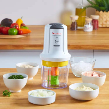 Mini Hachoir MOULINEX - Capacité de la cuve : 2 Litres - Puissance : 500W - Nombre de vitesses : 2 vitesses - Nombre de lames : 4 lames en acier inoxydable - Matériau du bol : Bon el Verre - Couleur : Gris - Garantie 1 an