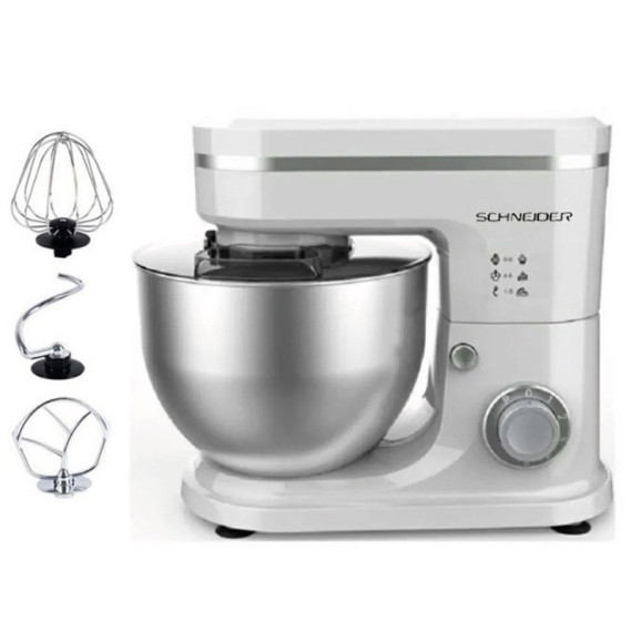 Robot Pétrin SCHNEIDER – Puissance 1500 W, Bol de 6 L, 6 vitesses + fonction Pulse, Arrêt automatique, Accessoires inclus (fouet, crochet et mélangeur), Facile à nettoyer et à ranger, Design moderne et intuitif, Format compact idéal pour les petites cuisines, Couleur : Inox, Garantie 1 an