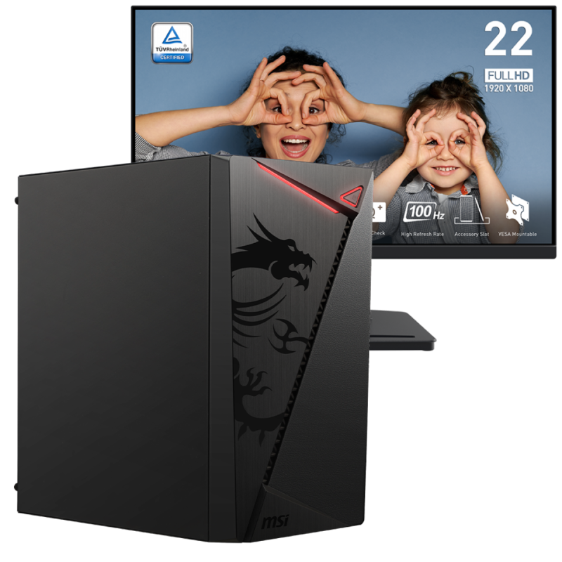 Écran MSI Pro MP225 21.5" Full HD IPS / 100 Hz / Noir - Boîtier Gamer MSI MAG SHIELD M301 - Processeur Intel Pentium Gold G6400, (Jusqu'à 4.0 GHz, 4 Mo de mémoire cache) - RAM 8 Go (1x 8 Go) DDR4 - Disque SSD 2.5" SATA 512 Go - Carte graphique Intel UHD Graphics - Carte mère MSI PRO H510M-B DDR4 - Boîte d'alimentation 500 W / Noir - Avec Ensemble Clavier et Souris Sans Fil Macro K715 - Garantie 2 ans