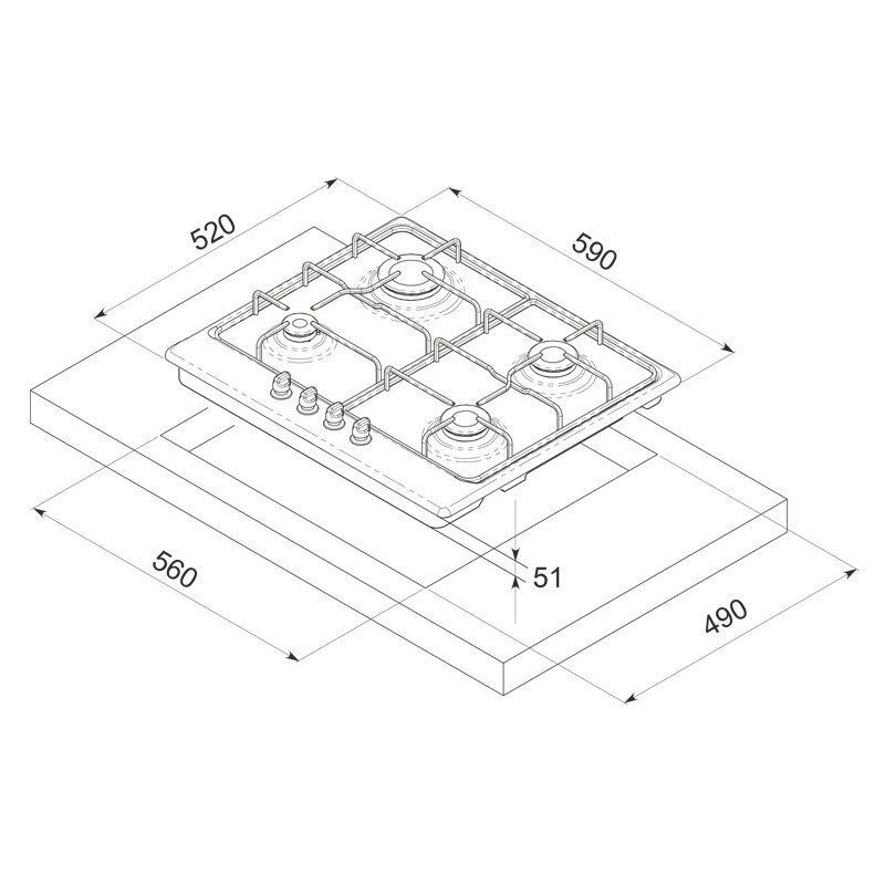 Table de cuisson Focus - Largeur : 60 cm - Nombre de Brûleurs : 4 Brûleurs à gaz - Flamme stabilisée - Grilles et chapeaux de brûleurs émaillées - Allumage Automatique - Commandes frontales - Dimensions 520 x 590 x 51mm - Couleur : Inox - Garantie 2 ans