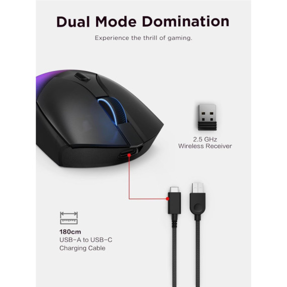 Souris Gaming Lenovo Legion M410 - Résolution 16000 PPP - 6 boutons programmables - Capteur de souris : Pixart 3335 - Connexion filaire et 2,4 GHz - Distance de fonctionnement : 10 m - Éclairage RGB à 2 zones réglables - Câble de chargement (USB-C vers USB-A) - Batterie au lithium 800 mAh (Jusqu’à 53 heures si le RGB est désactivé) - fréquence d’interrogation de 1 000 Hz - Interface USB - compatibles : Windows 10 ou version ultérieure - Longueur cable 1.8 m - Couleur Noir - Garantie 1 an